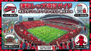 浦和レッズのアウェイ遠征を徹底解説。埼玉スタジアム2002へのアクセス(浦和美園駅から徒歩)、帰りの混雑対策、観戦のコツ、周辺グルメ、観光、おすすめホテルまで初心者にも分かりやすくまとめました。